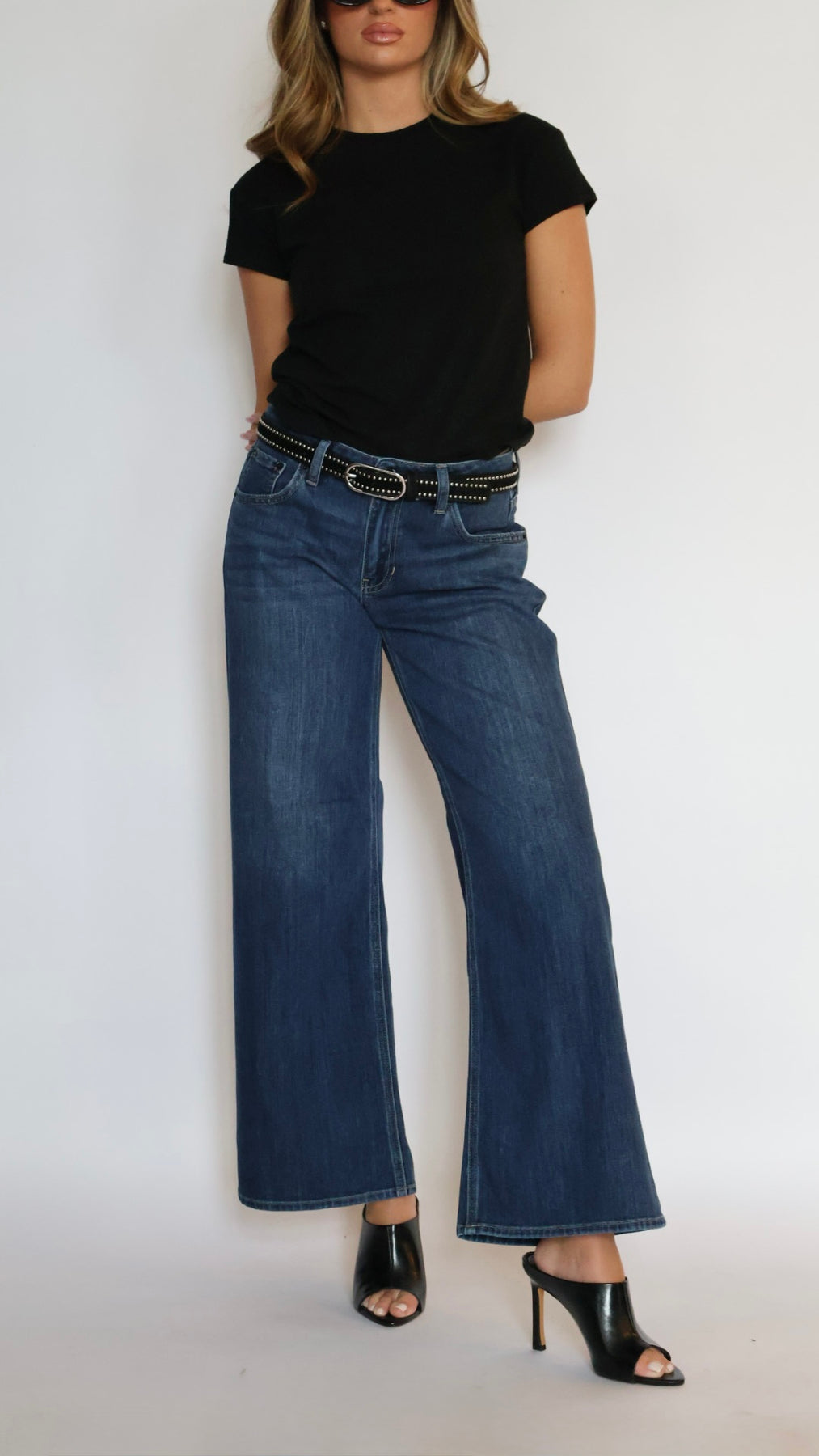 Designed for easy movement and bold style, these dark denim jeans feature a relaxed, flowing silhouette with a low-rise look. The wide palazzo legs elongate your frame, while flexible denim ensures all-day comfort-making them your go-to for effortless edge. 9'' RISE, 30'' INSEAM, 12'' OPENING