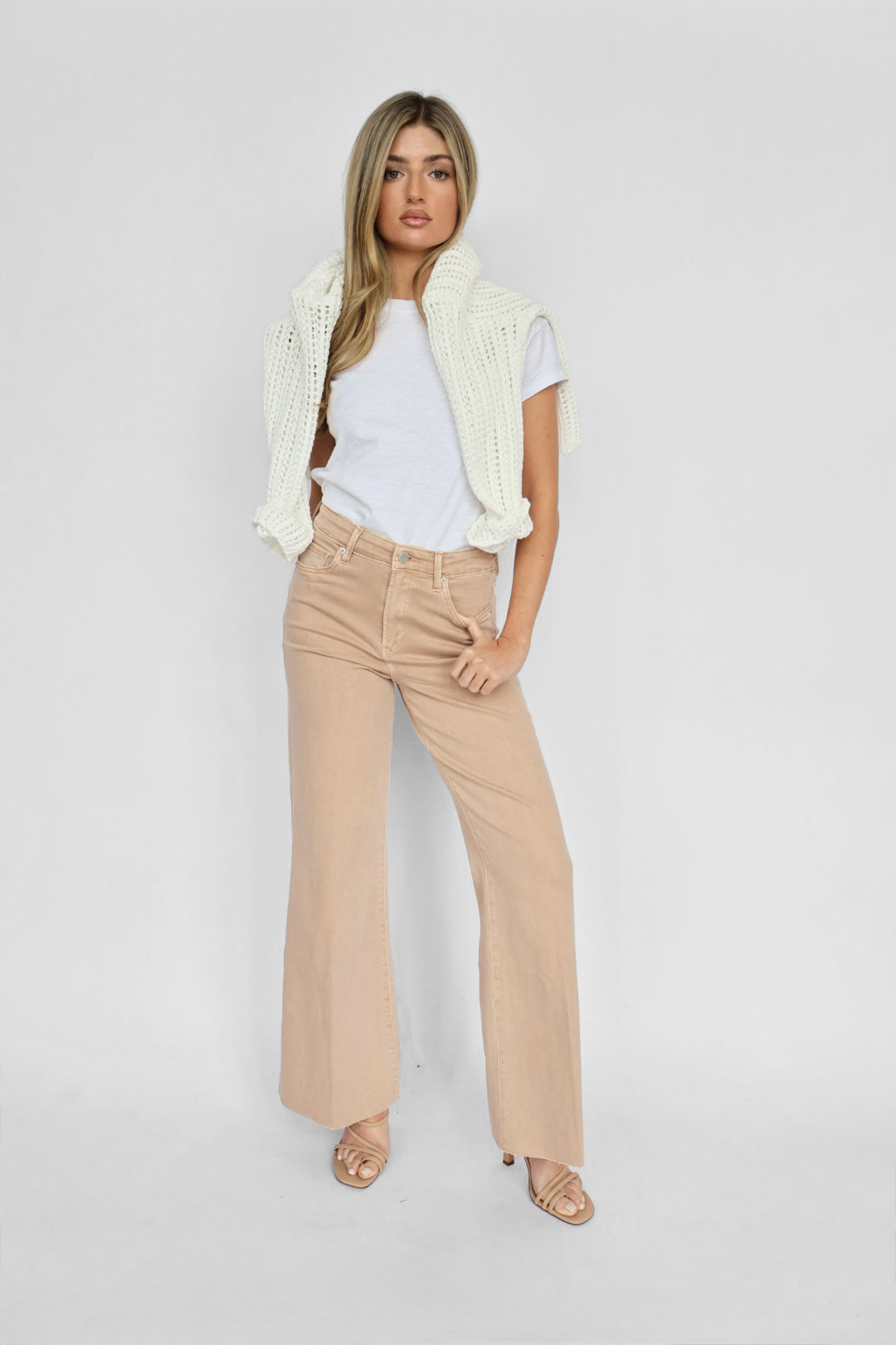 Style with a fitted knit tank or tailored blouse to balance the wide-leg silhouette. Add a structured blazer and heeled sandals for an elevated daytime look, or pair with a relaxed sweater and sneakers for effortless weekend polish.