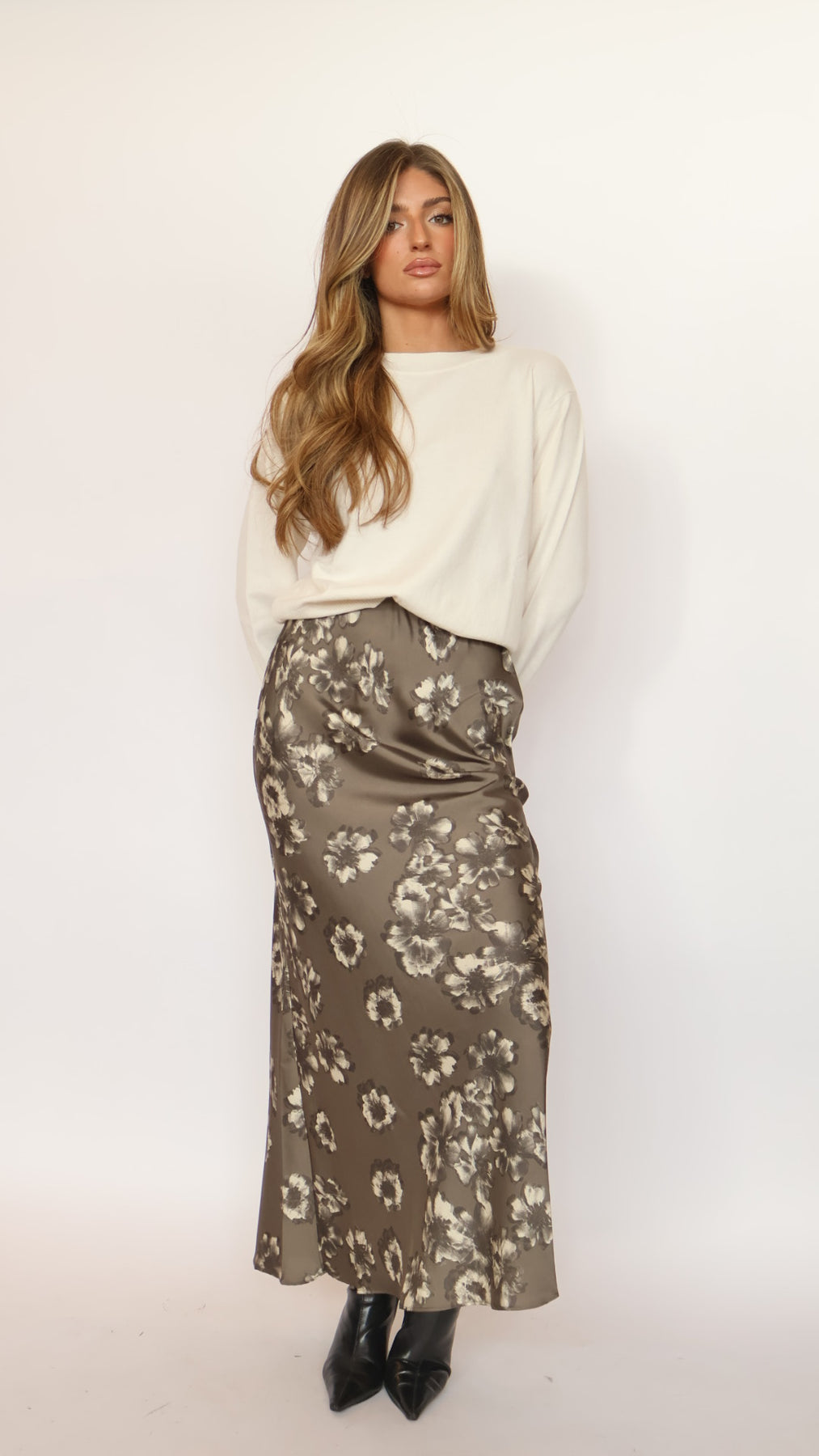 Floral Satin Elastic-waist Straight Maxi Skirt
