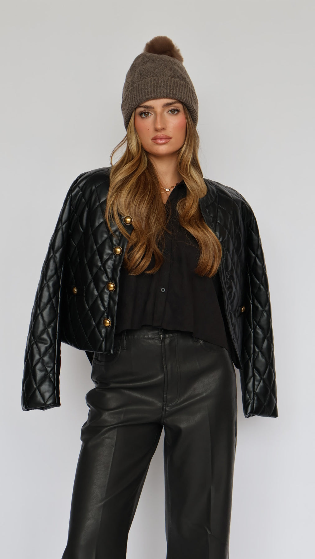 Elevate your outerwear with the Bonheur Vegan Leather Jacket from Dear John Denim — a polished take on a timeless classic. Crafted from supple quilted vegan leather, this collarless jacket combines sleek sophistication with everyday versatility. The gold button detailing adds a touch of refined glamour, while the tailored fit creates a flattering, modern silhouette.