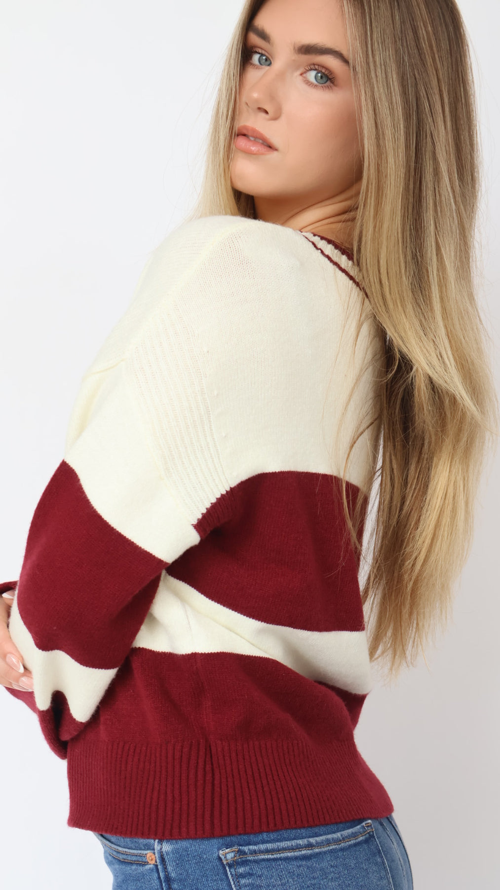 Classic stripes meet cozy comfort in the Thread & Supply Tabitha Sweater. Designed in a rich burgundy hue with contrasting stripes, this knit offers a timeless look with a modern, relaxed fit.