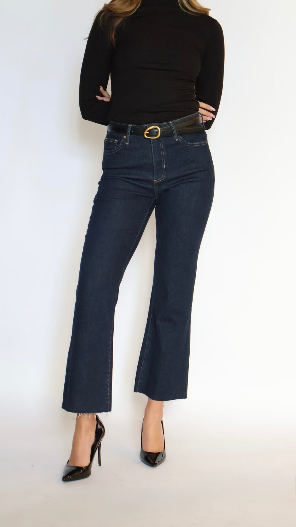 Featuring a figure-flattering high-rise waist, these non-stretch jeans deliver a sleek fit with a cropped flare leg that feels both modern and timeless. Finished in a rich dark denim wash, they bring a touch of sophistication to any look—perfect for everything from casual days to dressed-up nights.