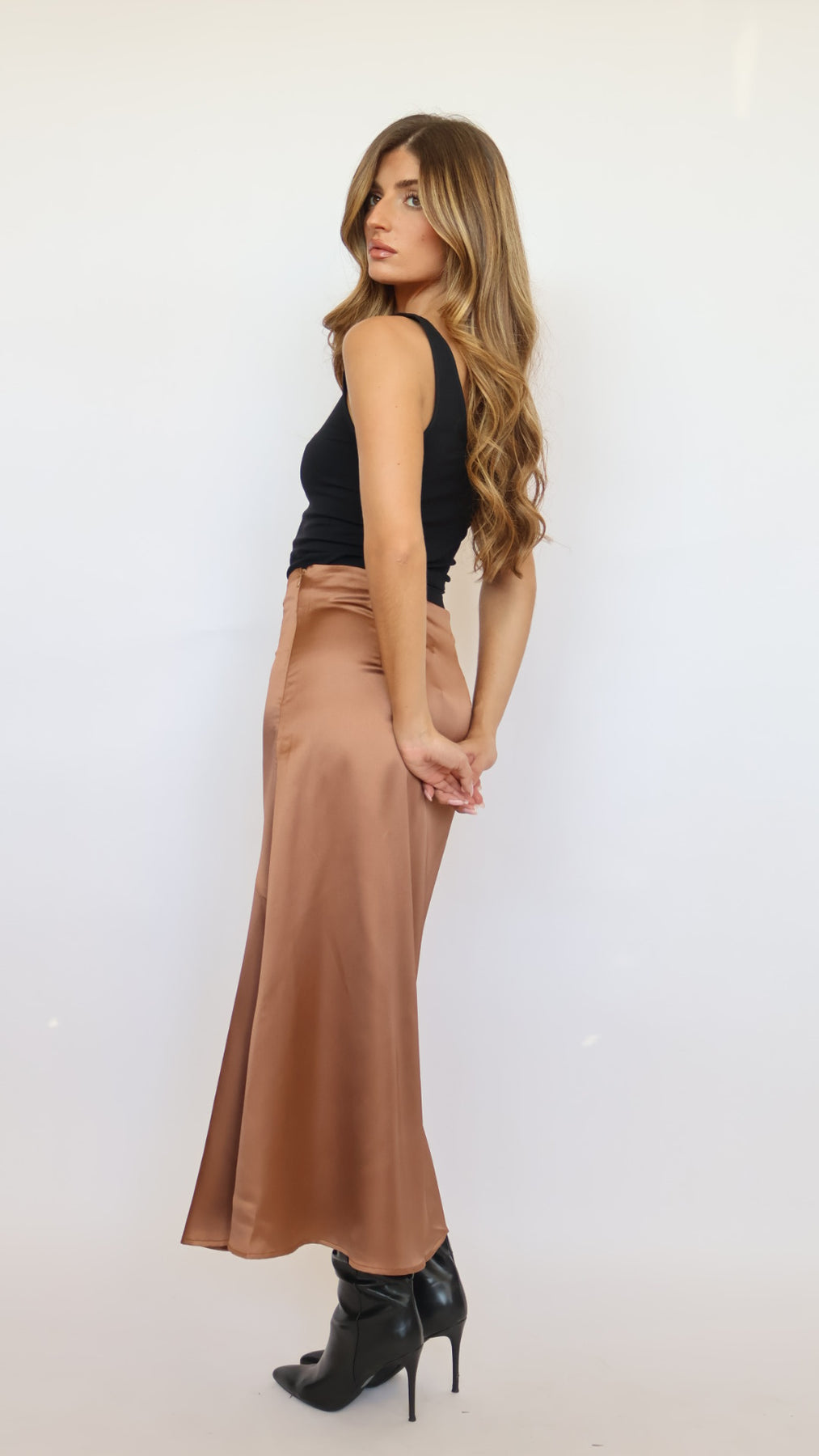 The mid-length design makes it easy to style—pair it with a fitted knit, camisole, or structured blazer for an elevated look that transitions seamlessly from day to night. Whether you dress it up with heels or down with boots, this satin skirt delivers understated sophistication with a touch of edge.