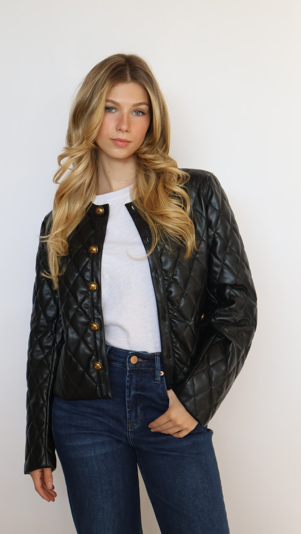 Elevate your outerwear with the Bonheur Vegan Leather Jacket from Dear John Denim — a polished take on a timeless classic. Crafted from supple quilted vegan leather, this collarless jacket combines sleek sophistication with everyday versatility. The gold button detailing adds a touch of refined glamour, while the tailored fit creates a flattering, modern silhouette.